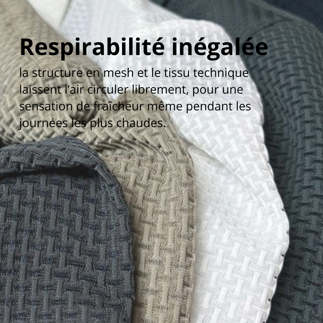 C’est ainsi qu’est né le Vyno™ : un tissu léger, des détails en mesh pour laisser l’air circuler, et un design raffiné qui s’adapte à toutes les occasions.