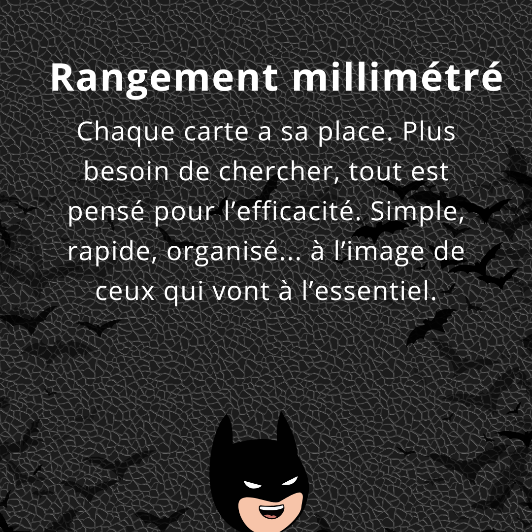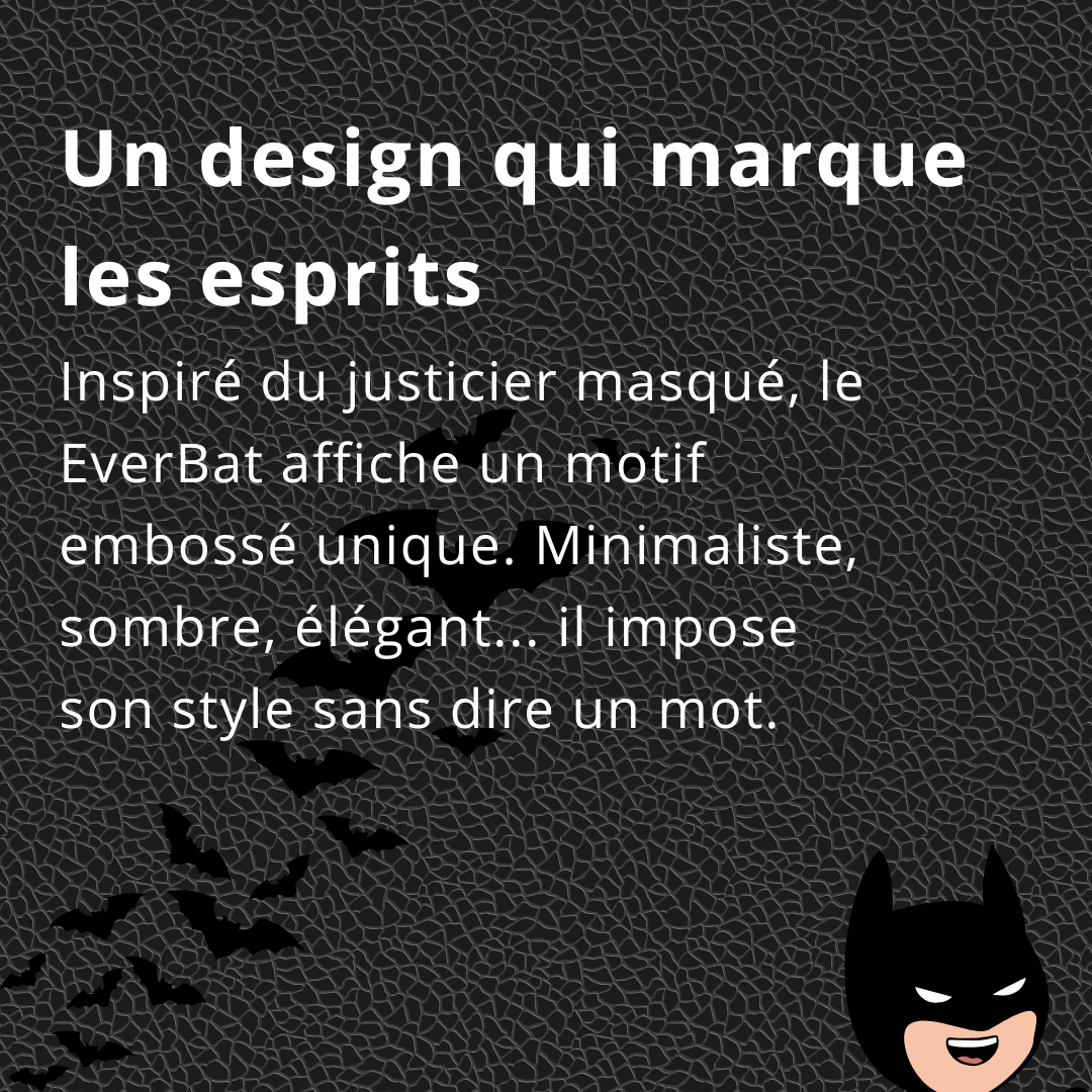 Tu cherches un portefeuille compact, classe et un brin mystérieux ? Le EverBat est fait pour toi. Inspiré par l’univers du justicier masqué, il combine look discret et praticité redoutable. Un vrai coup de cœur pour les amateurs de style sobre et efficace.